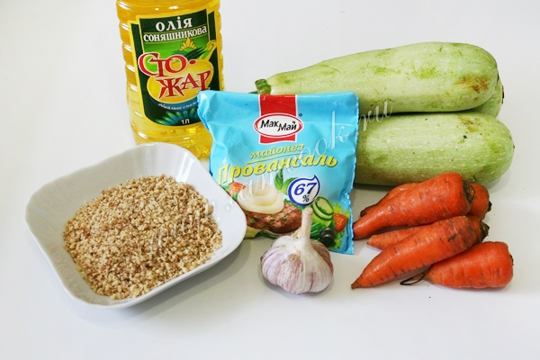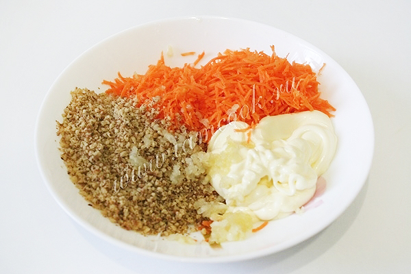 В глубокой тарелке соедините морковь с майонезом, орехами и пропущенным через пресс чесноком. Посолите по вкусу и хорошо перемешайте.