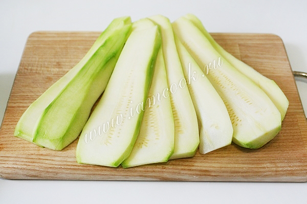Кабачки помойте и нарежьте вдоль пластинами толщиной примерно 5 мм.