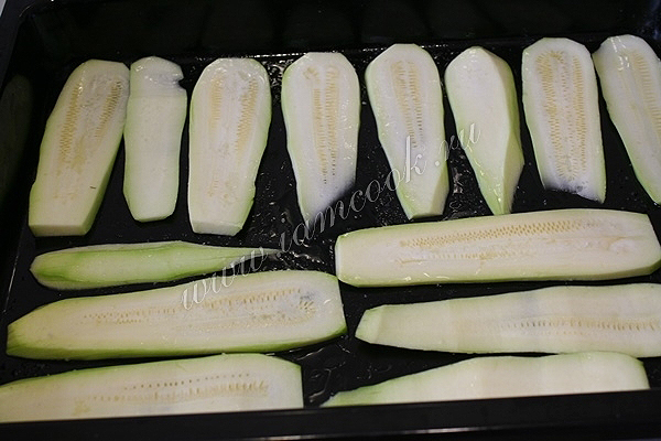 Пластины кабачков можно обжарить на растительном масле на хорошо разогретой сковороде или можно запечь в духовке. Я выбрала второй вариант. Каждую пластину слегка посолите, смажьте растительным маслом и выложите на смазанный маслом противень. Запекайте кабачки в духовке 15-20 минут при 180 градусах.