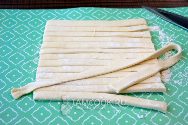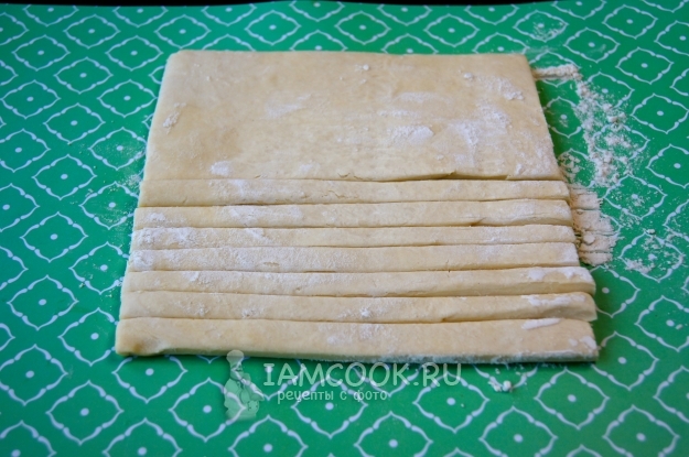Рабочую поверхность присыпьте мукой, выложите тесто и нарежьте на тонкие полоски. У меня было тесто приблизительно 10x10 сантиметров, я нарезала на 14 полосок.