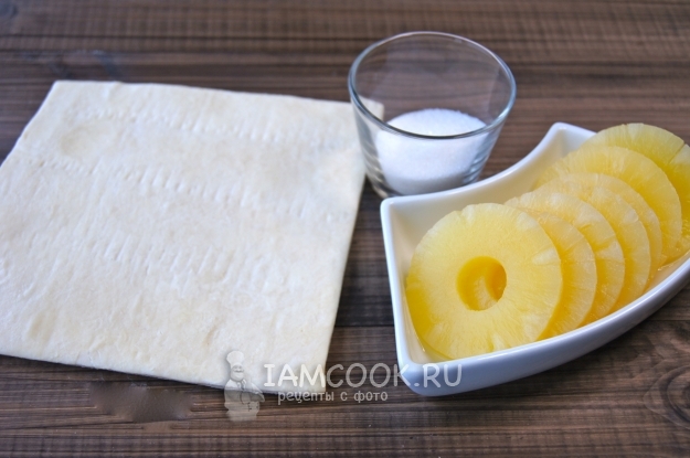 Итак, подготовьте все необходимые продукты для приготовления слоек с ананасами (из слоеного теста) в духовке.