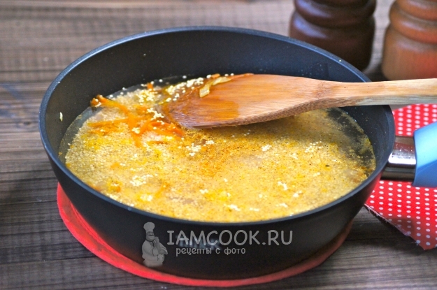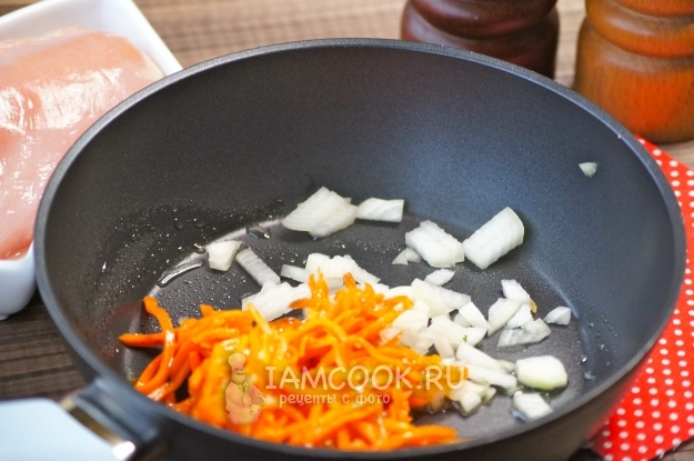 Очистим лук, мелко нарежем и обжарим с морковкой по-корейски на сковороде с растительным маслом до мягкости.