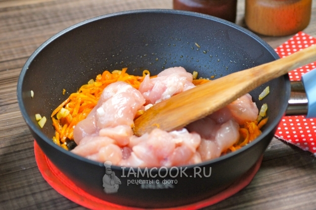 Филе курицы нарежем на небольшие кусочки, выложим в сковороду и перемешаем.