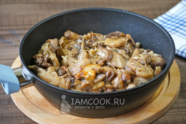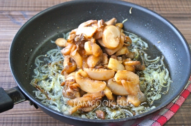 Добавьте слегка размороженные шампиньоны и обжарьте.
