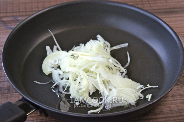 Нарежьте лук полукольцами и обжарьте до румяности на сковороде с растительным маслом.