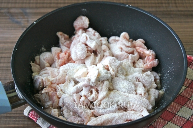 Филе куриного бедра нарежьте тонкой соломкой поперек волокон, выложите в пакет с мукой, закрепите край пакета и как следует встряхните, чтобы каждый кусочек курицы обвалялся в муке.