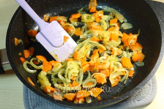 Выкладываем овощи на сковороду с маслом и тушим на небольшом огне 3-5 минут.