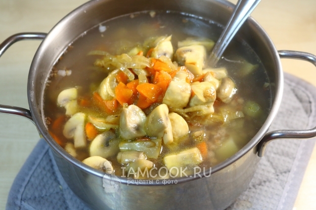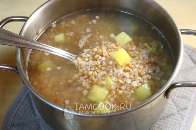 Доводим до кипения и варим 10 минут до готовности ингредиентов. Гречка сильно разбухнет, суп заметно загустеет.