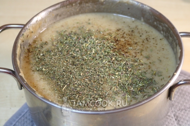 Перемешиваем и пюрируем блендером до однородности. Всыпаем специи по вкусу: соль, черный молотый перец, тимьян и базилик.