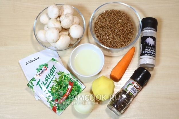 Суп-пюре из гречки можно смело называть диетическим. К тому же блюдо подходит для детей. Если же хотите получить более сытный и калорийный вариант готового блюда, можно сделать следующее. Во-первых, добавить в рецептуру какое-либо мясо и использовать мясной бульон. Во-вторых, готовый крем-суп из гречки можно подавать со сметаной или вообще добавить сливки на последнем этапе приготовления. Думаю, так будет и жирнее немного, и вкуснее. Ну а мы готовим простой диетический вариант. Возьмём такие ингредиенты.