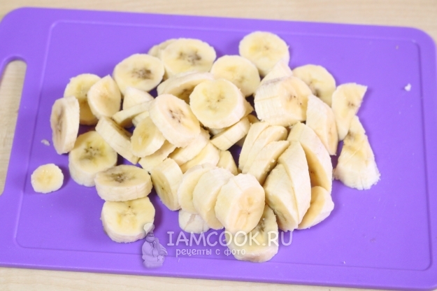 Тем временем очищаем от кожуры бананы и так же некрупно режем.