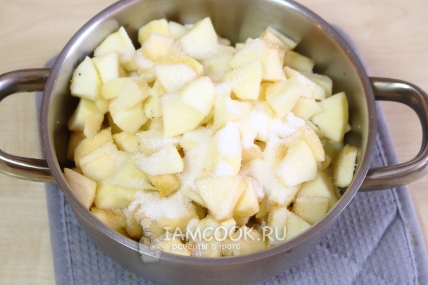 Выкладываем в кастрюлю, желательно толстостенную, засыпаем сахарком и ставим на небольшой огонь тушиться до мягкости яблок.