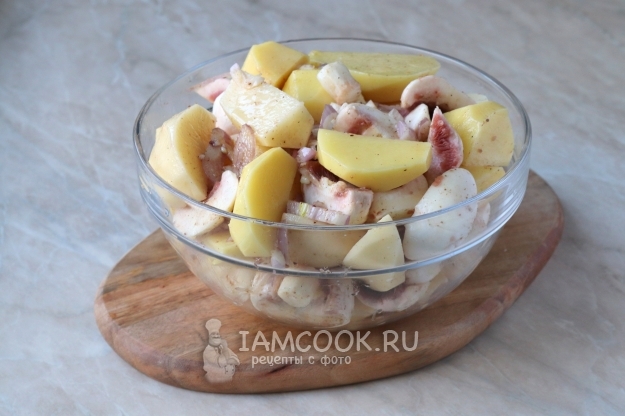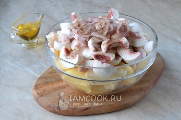 Картофель, грибы и лук соедините в глубокой миске. Добавьте растительное масло и сванскую соль. Соль можно использовать и обычную, но тогда лучше добавить ещё каких-нибудь приправ, например, чёрный молотый перец и итальянские травы, также отлично подойдут.