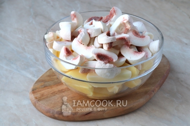 Очищенные шампиньоны нарежьте толстыми пластинами.