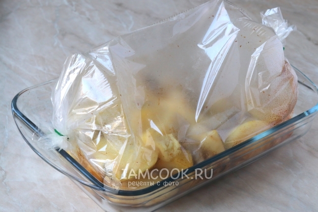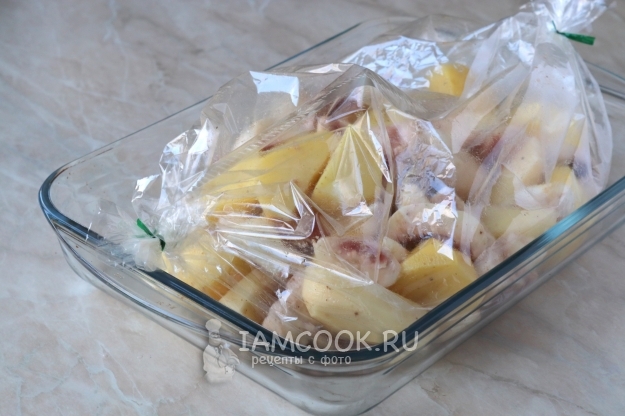 Картофель с грибами и луком переложите в рукав для запекания. Концы пакета плотно завяжите и выложите на противень или в жаропрочную форму. Отправьте картошку с шампиньонами в рукаве в духовку, разогретую до 180 градусов, на 30-40 минут.