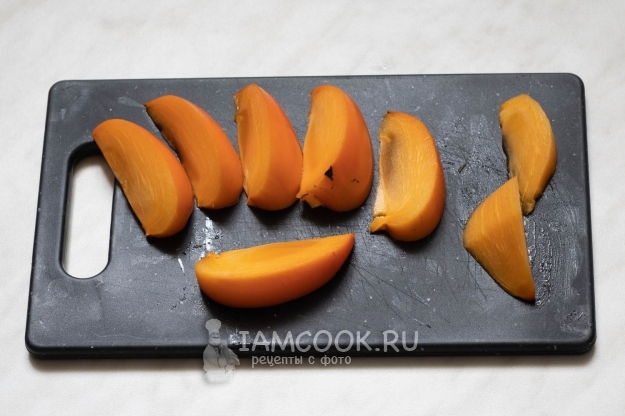 Хурму режем на восьмушки (или даже более мелко, если она крупная). У неудачных кусков (с пятнами, слишком мягких - короче, просто не самых красивых) срезаем кожицу, из них будем готовить соус.