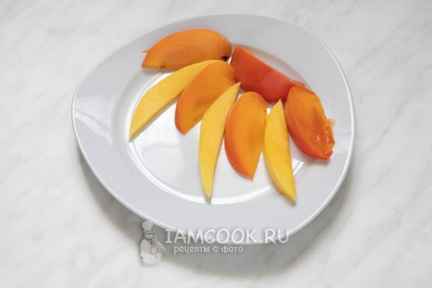 На плоской тарелке раскладываем дольки веером по очереди: хурма-манго, хурма-манго и так далее.