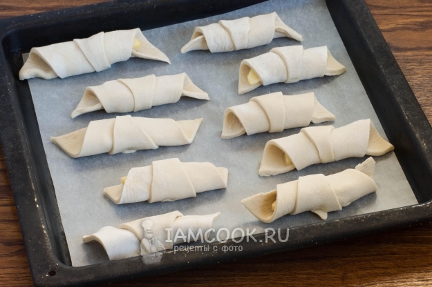 Аккуратно сверните рогалики, начиная с широкого края. «Хвостик» должен быть снизу, чтобы при выпечке рогалики не развернулись. Выложите рогалики на противень, застеленный пергаментной бумагой. Если вы не знаете, как сильно увеличится тесто при выпечке, то оставьте между рогаликами побольше пространства.