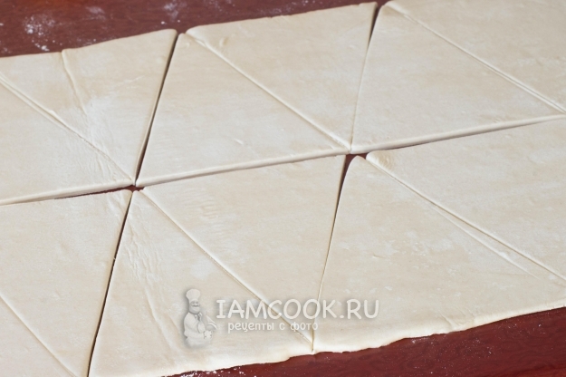 Слоеное тесто необходимо разморозить, развернуть на слегка присыпанном мукой столе. Немного раскатайте тесто в относительно правильный прямоугольник. Разрежьте его на треугольники. У меня получился треугольник примерно 10 см в основании и 16 см в высоту.
