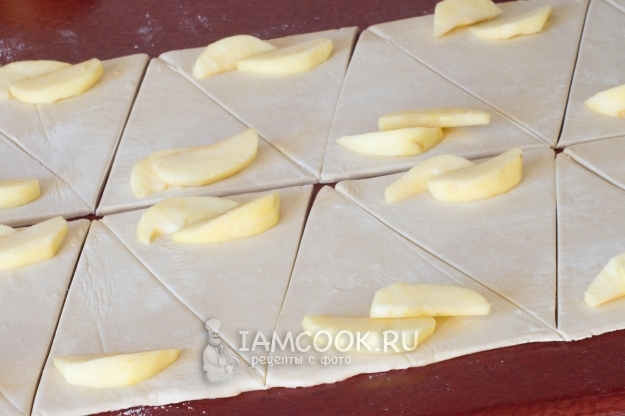 Яблоки промойте, удалите шкурку и сердцевину, нарежьте яблоки дольками. Выложите 1-2 дольки на широкий край треугольника.