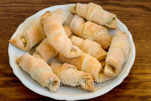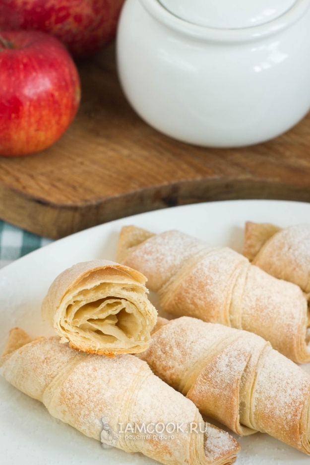 Готовые рогалики из слоеного теста с яблоками необходимо снять с противня, остудить и посыпать сахарной пудрой.
