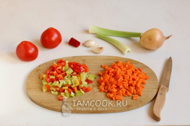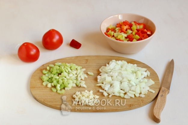 Уберем нарезанные морковь и перец в миску, далее нашинкуем очищенную головку репчатого лука, стебли сельдерея нарежем небольшим кубиком и измельчим чеснок.