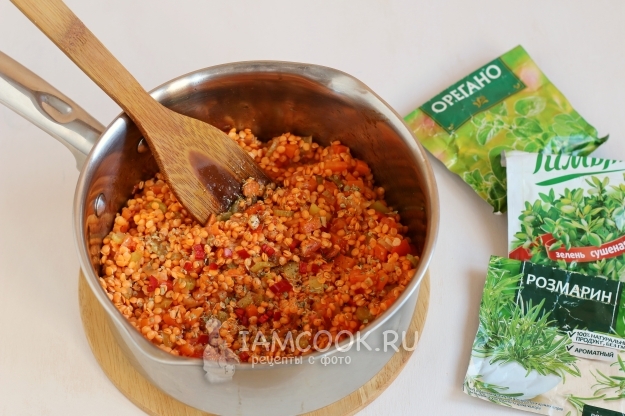 Затем всыпаем промытую чечевицу и ароматные травы, перемешаем.