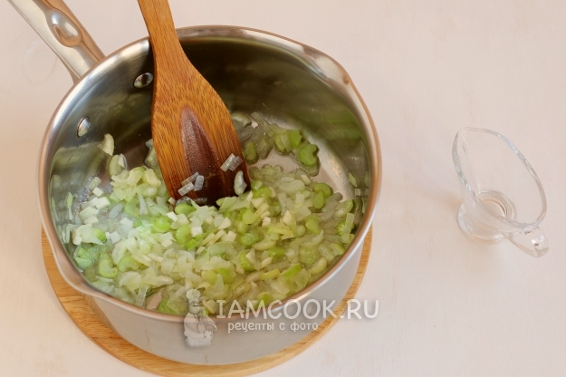 Обжаривать овощи будем в кастрюле, в которой и будем варить суп факес. Вначале обжарим на растительном масле лук, через минуту добавим сельдерей, еще через минуту - чеснок. Обжариваем овощи до мягкости на небольшом огне.