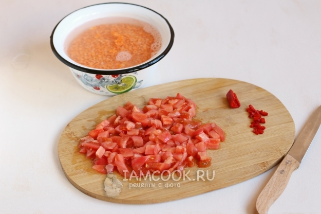 Пока обжариваются овощи, промоем несколько раз чечевицу, чтобы вода стала полностью прозрачной. Также нарежем кубиком очищенные от шкурки помидоры и измельчим острый перец. Количество острого перца чили берите на свой вкус.