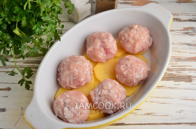 Форму для запекания смажьте растительным маслом. На дно выложите кружочки картофеля в один слой, слегка подсолите. Мокрыми руками сформируйте круглые небольшие тефтели и выложите сверху на картофель.