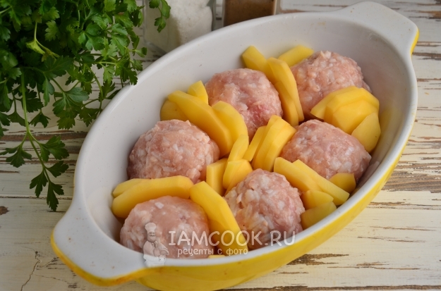 Оставшийся картофель разложите между тефтелями, его также слегка подсолите.