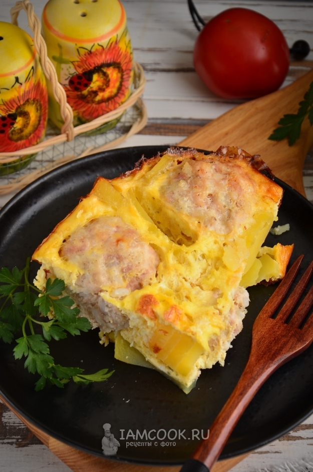 Накройте форму фольгой и сделайте в ней прорези. Поставьте в духовку на 25-30 минут. Через 15 минут фольгу можно снять и готовить запеканку с тефтелями уже дальше без нее. Заодно будет возможность оценить степень готовности запеканки.