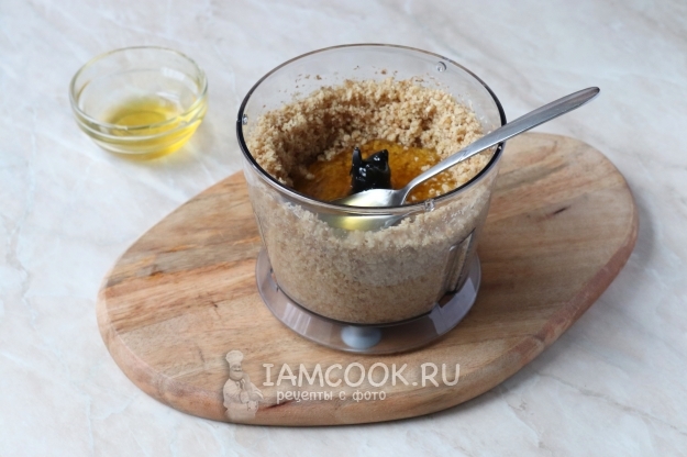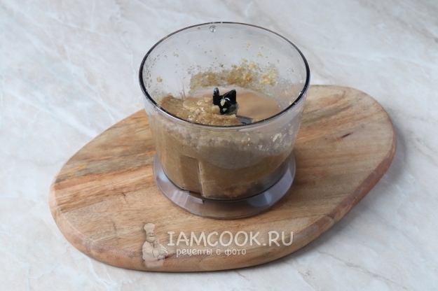 Грецкие орехи очистите от скорлупы. Затем ядра (150 г) выложите в чашу блендера с насадкой нож-измельчитель и перебейте до однородной массы.