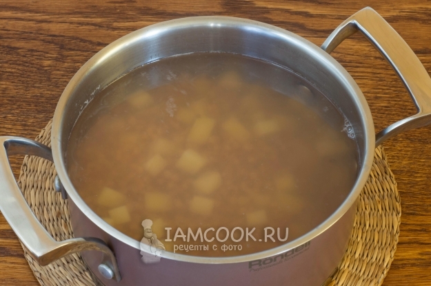 В кастрюле доведите до кипения воду. Почистите и мелко нарежьте картофель, добавьте его в суп. Промойте гречневую крупу и также добавьте в суп. После закипания варите 15 минут.