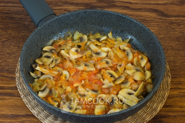 Добавьте произвольно чистые шампиньоны. Обжарьте еще 3-4 минуты. Помидор промойте, разрежьте на четвертинки, натрите на мелкой терке так, чтобы остались одни шкурки. Измельченную мякоть добавьте на сковородку. Протушите зажарку еще пару минут.
