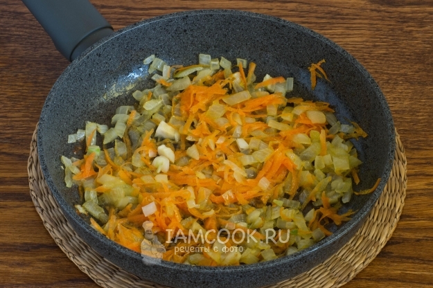 На сковородке разогрейте растительное масло. Выложите нарезанный мелкими кубиками лук и натертую на крупной терке морковь. Обжаривайте овощи, помешивая, до мягкости.