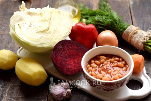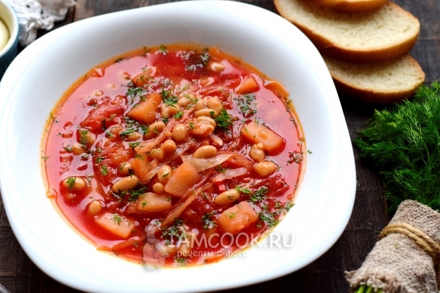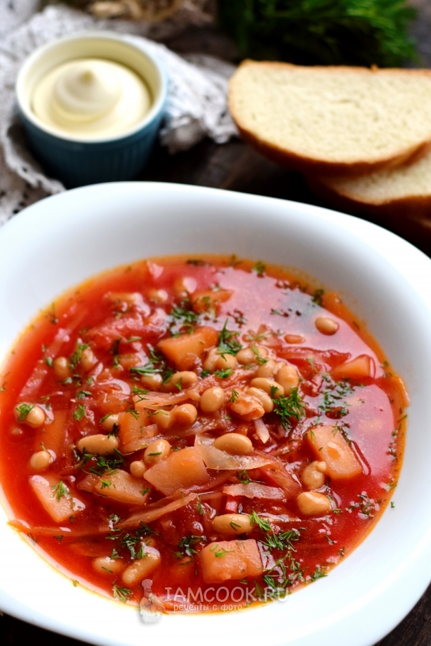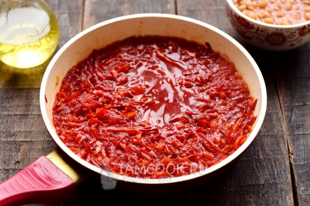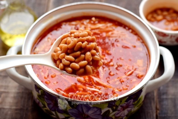 Когда картофель станет мягким, в бульон поместите капусту, перекиньте пассерованные овощи, а также консервированную фасоль из банки вместе с томатом. Варите борщ еще 5 минут.