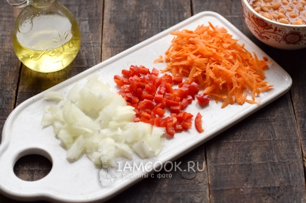 С моркови и лука счистите верхний слой, лук нарежьте кубиками, морковь натрите на крупной терке. Перец нарежьте аналогично луку.