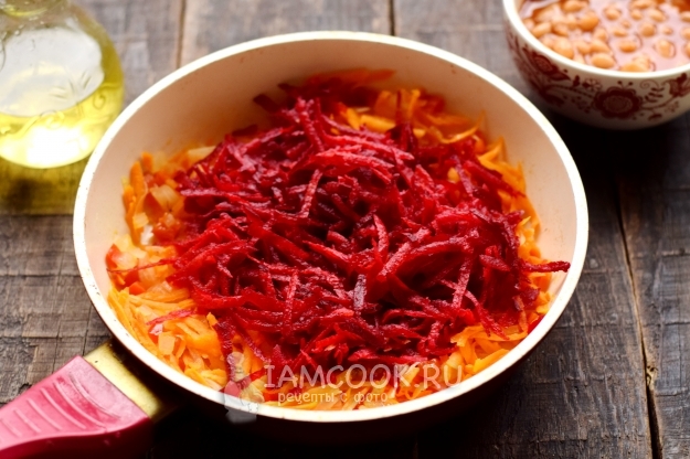 На плиту поставьте сковороду, влейте масло, разогрейте. Сначала закиньте нарезку лука и перца, обжарьте в масле, через несколько минут добавьте морковь. Свеклу очистите, также натрите на крупной терке, отправьте в емкость вслед за морковью.
