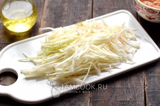 Кочан капусты отделите от верхних листочков, нашинкуйте тонкими полосками.