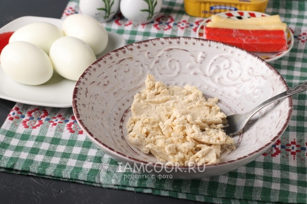 Яйца сварить вкрутую, очистить от скорлупы. В тарелку выложить плавленый сырок и размять его вилкой.