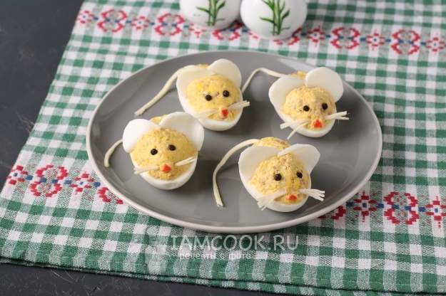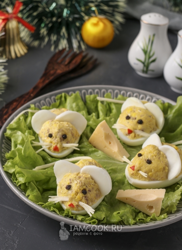 Предлагаю приготовить праздничные фаршированные яйца в форме мышек (печенью трески). Такая закуска многим знакома, я также готовила её не один раз, а вот оформить к наступающему новому году предлагаю свой вариант. Сложности в приготовлении закуски нет, главное - иметь немного усидчивости и аккуратности. По большому счёту начинку можно взять любую по своему вкусу, но мы очень любим фаршировать яйца печенью трески.
