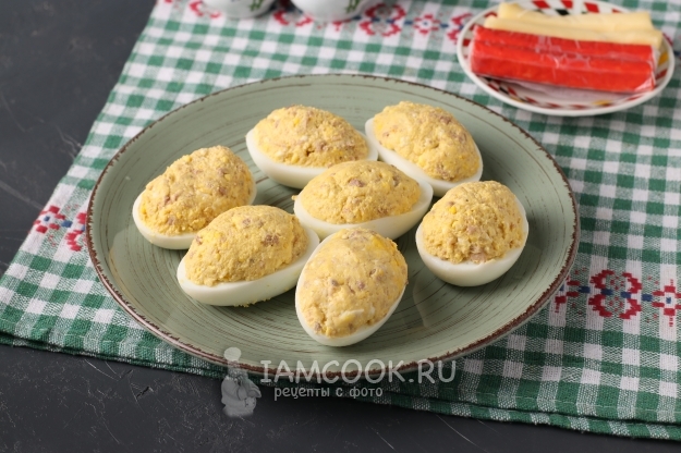 Наполнить полученной массой белковые половинки яиц. Две половинки оставить для изготовления ушей.