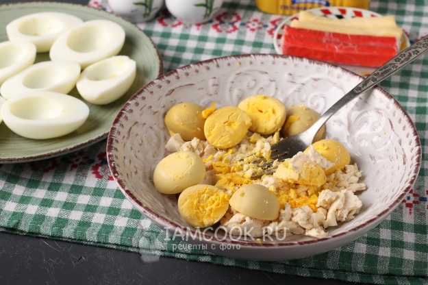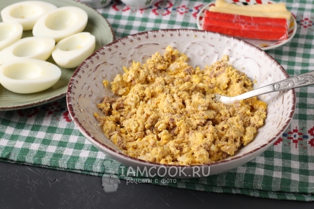 Разрезать яйца на половинки, извлечь желтки и добавить их к сыру.