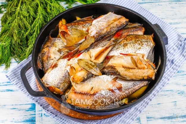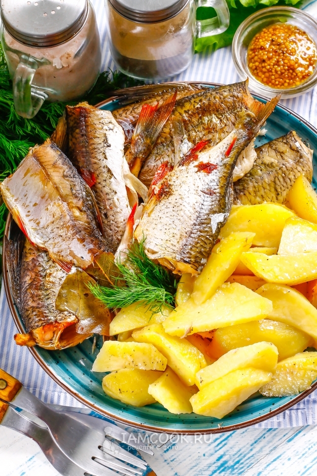Накройте форму фольгой, чтобы не было выхода для пара. Разогрейте духовку до 220 градусов и поместите в нее форму. Запеките плотву с картофелем в духовке около 35-40 минут.