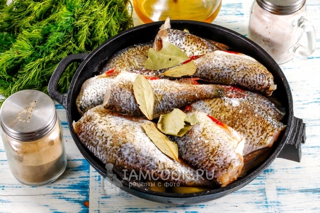 Сверху на рыбку выложите лавровые листья и влейте сбоку в форму теплую воду.