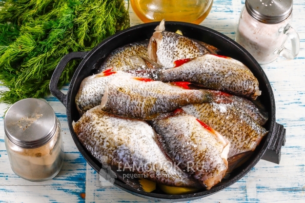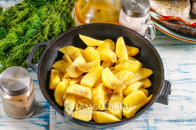 Выпотрошенную и очищенную плотву промойте в воде, обсушите бумажными полотенцами. Каждую тушку рыбы натрите солью и молотым черным перцем. Выложите на картофельную нарезку.