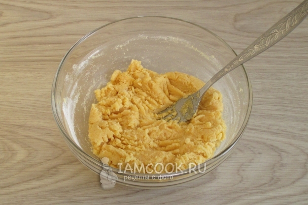 Перемешайте ингредиенты сначала вилкой или лопаточкой, а затем замесите руками. Это делается за считанные минуты. Тесто для кукурузного печенья должно получиться мягким, хорошо формирующимся и как бы шершавым на ощупь.
