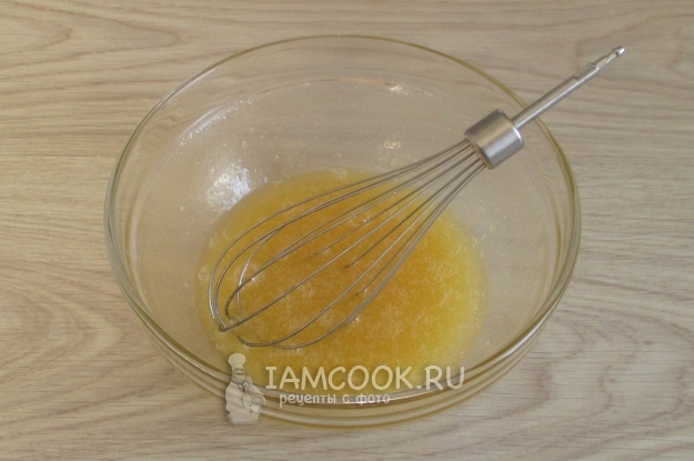 Мёд для теста нужен в жидком виде. Его можно нагреть на слабой мощности в микроволновке или на пару. Не в горячий, а в теплый или комнатной температуры мёд разбейте яйцо и влейте растительное масло.
