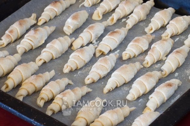 Каждый треугольник скатайте в рулетик, начиная с широкого края. Выложите на противень, застеленный пергаментной бумагой. Смажьте подготовленные рогалики сметаной (я пользовалась силиконовой кисточкой). Можно посыпать рогалики сверху сахаром или опять же смесью сахара и корицы.